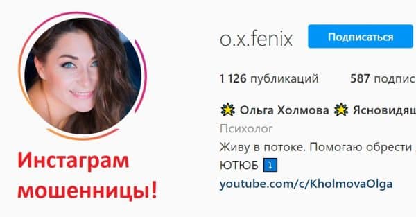 На ясновидящую шарлатанку Ольгу Холмову с сайта: yourlife.com.ua/pomoshh-yasnovidyashhej-onlajn-besplatno, инстаграм шарлатанки: instagram.com/o.x.fenix. Читаем негативный отзыв о шарлатанке Ольге Холмовой: