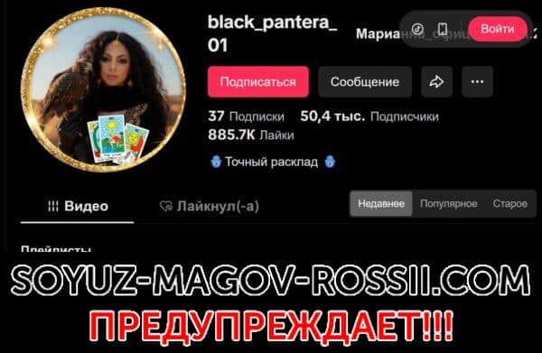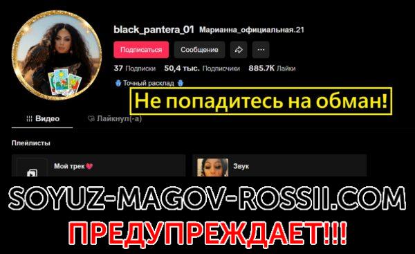 Маг Марианна из Тик Ток (black_pantera_01) в очередной раз получила очень плохой отзыв. Я не смогла вовремя распознать в Марианне из ТикТок, где она имеет ник: black_ pantera_01, мерзкую личность, которая способна обманусь меня. От этого мне, конечно, немного грустно, но главной для меня стала месть, потому что я уж точно не намерена прощать эту шарлатанку, которая живет за чужой счёт. Мне страшно, что маг из Тик Тока (black_pantera_01) Марианна так любит деньги, что ни за что не остановится.