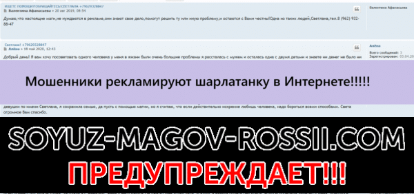 Здравствуйте, Союз Магов России! Мне очень важно выговориться, потому что я в шоковом состоянии и то, через что я пришла, заставит задуматься о том: стоит ли доверять мошенническому форуму:babki-gadalki.ru, который порекомендовал мне Светлану в качестве хорошего мага, но эта Светлана сделала мою жизнь невыносимой, и я больше не хочу с ней иметь ничего общего, как и с этим форумом, что предлагает честным людям мошенников. Я никогда не предполагала, что люди могут так искусно врать друг другу и при этом зарабатывать деньги на вранье, которое все равно рано или поздно раскроется. Мне стыдно за саму себя, что я так беспечно повелась на этот развод, потому что хотела избежать разлада с мужем, потому что мне был дорог наш брак, ведь я считала, что он должен быть один и на всю жизнь. Я очень счастлива, что моя судьба привела меня на Союз Магов России, где меня обязательно должны понять правильно, ведь много лет Вы ведете борьбу за справедливость в Интернете, и я начинаю приходить в ужас, что нас очень много. Я надеялась до последнего, что маг Светлана окажется хорошим специалистом в своей области, но, к сожалению, все закончилось слишком банально, но я не опустила рук и нашла выход из сложившейся ситуации, поскольку мне придется возвращать теперь не столько мужа, сколько деньги, которые забрала у меня мошенница Светлана, и я ничего с этим не могла поделать. Я очень люблю мужа, но сейчас это все, что я могу о нем сказать, поскольку действия Светланы расходились с её словами, и мне очень неловко, что я делала для этой женщины все , а ко мне с первой минуты относилась, как к полной дуре, способной верить в сказки. Мне очень хочется найти способ, чтобы наказать эту странную женщину, которая способна обдурить любого за лишнюю копейку в своем кошельке. Со Светланой я связалась по номеру телефона: 89629328847 , но теперь она уже не отзывается на мои звонки, хотя первое время всегда была на связи. Мне очень нелегко понимать ту реальность, которая слишком сильно душит меня сейчас, но я изо всех сил борюсь и надеюсь, что Ваш проект найдет на нее управу, потому что с этим необходимо что-то делать, а я уже не могу справиться в одиночку с судьбой. Меня слишком обидела маг Светлана своим обманом, и я не могу с этим смириться, поскольку мошенница Светлана забрала приличную денежную сумму в размере: 59 700 руб., и ей не стыдно от этого, потому что я лично сгораю от стыда,, а ей все равно на мои мучения и, к сожалению, не только на мои, потому что мне сильно не нравится то, что она желает с человеческой психикой, которая сильно страдает от её обманных действий. Меня маг Светлана кинула, когда я была уверена в результате, которого на самом деле даже не должно было быть, и мошенница знала об этом.