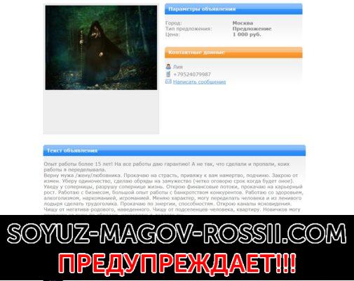 Маг Лия +79524079987 развела женщину на достаточно крупную сумму и перестала выходить на связь. Читаем и не попадаемся. Здравствуйте, дорогой Союз Магов России! Мне обидно до слез, потому что я попалась на удочку к шарлатанке магу Лие, которая обманула меня и развела на большие деньги. Когда-то я радовалась, что нашла ее телефон: +79524079987 в одном из объявлений интернета. Ситуацию была критическая для нас с мужем, поэтому я и хотела решить ее поскорее.
